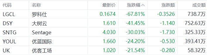 美股异动丨罗科仕跌67.81%,为跌幅最大的中概股