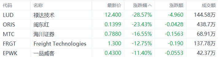 中概股收盘跌幅前五的个股为:禄达技术跌28.57%,闽东红跌23.43%,海川证券跌16.55%,Freight Technologies跌12.75%,一品威客跌11.4%。(格隆汇)