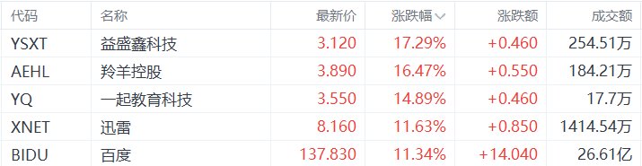 中概股收盘涨幅前五的个股为:益盛鑫科技涨17.29%,羚羊控股涨16.47%,一起教育科技涨14.89%,迅雷涨11.63%,百度涨11.34%。(格隆汇)
