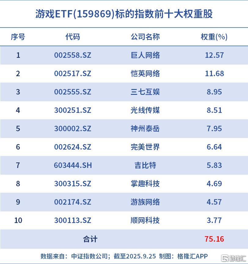 其中,游戏ETF(159869),跟踪的中证动漫游戏指数,一指网罗A股游戏产业龙头,聚焦巨人网络、恺英网络、吉比特、三七互娱、神州泰岳等A股游戏头部玩家,也囊括光线传媒、奥飞娱乐等影视动漫制作公司,成份股26只,少而精,权重股还不乏创业板±20%涨跌幅限制的高弹性标的。