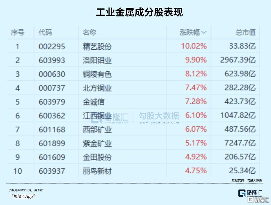 有色金属板块强势拉升,铜方向领涨。精艺股份开盘一字涨停,连续第2日封板,股价创近8年新高,洛阳钼业、北方铜业、铜陵有色等涨幅居前。