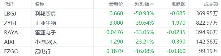 中概股收盘跌幅前五的个股为:利邦厨具跌50.93%,正业生物跌39.64%,雷亚电子跌33.05%,小i机器人跌23.21%,易电行跌16.08%。(格隆汇)