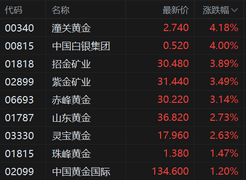 国际金价持续创下历史新高,带动港股黄金股集体上涨,潼关黄金涨4.18%,招金矿业涨近4%,紫金矿业涨3.5%,赤峰黄金涨超3%,山东黄金、灵宝黄金近3%,珠峰黄金、中国黄金国际涨超1%。