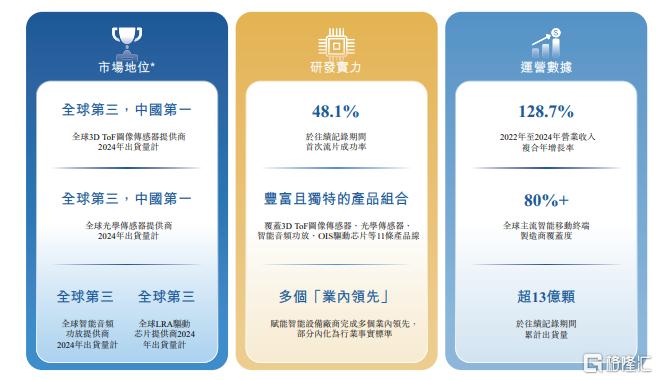 凭藉持续的技术深耕与创新拓展,公司成功实现从单一传感技术向智能感知、机器视觉及影像技术综合平台的跃升。公司在三大核心领域深度布局,建构丰富多元的产品矩阵。通过将智能算法与前沿感知芯片深度协同设计,公司致力提供「芯片+算法」深度融合的整体解决方案,以释放产品的物理极限性能。公司的解决方案已广泛应用於移动智能设备、物联网等消费电子领域,并积极拓展机器人、数字孪生及汽车电子等新兴成长领域,为更广泛的场景赋能智能感知能力。