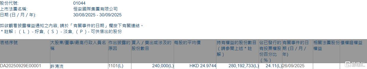 格隆汇9月30日丨据联交所最新权益披露资料显示,2025年9月26日,恒安国际(01044.HK)获执行董事许清流在场内以每股均价24.9744港元增持24万股,涉资约599.39万港元。
