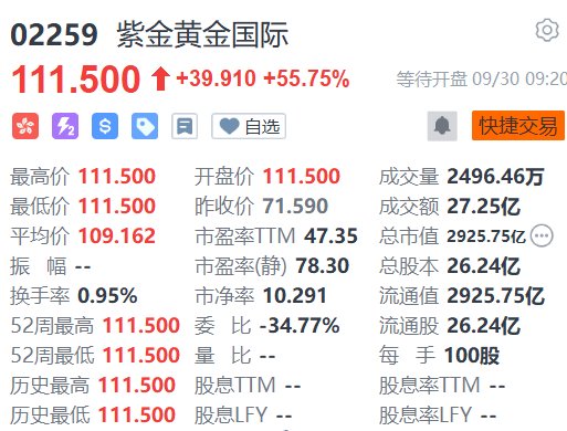 由紫金矿业(2899.HK)分拆的紫金黄金国际(2259.HK)今日首日在港挂牌上市,高开55.75%报111.5港元。一手100股,最多账面赚3991港元。