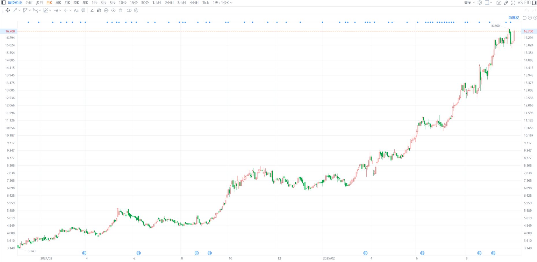 康臣药业(1681.HK)午后继续上扬,一度涨4.55%至16.78港元,股价逼近一周前(9月23日)盘中创下的历史新高(16.86港元),市值达143亿港元。该股去年累涨132%,今年迄今又进一步累涨超1.2倍。