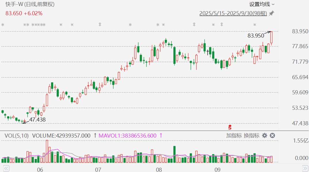 快手-W(1024.HK)快速拉升,涨超6%报83.95港元,股价创2022年7月以来新高。