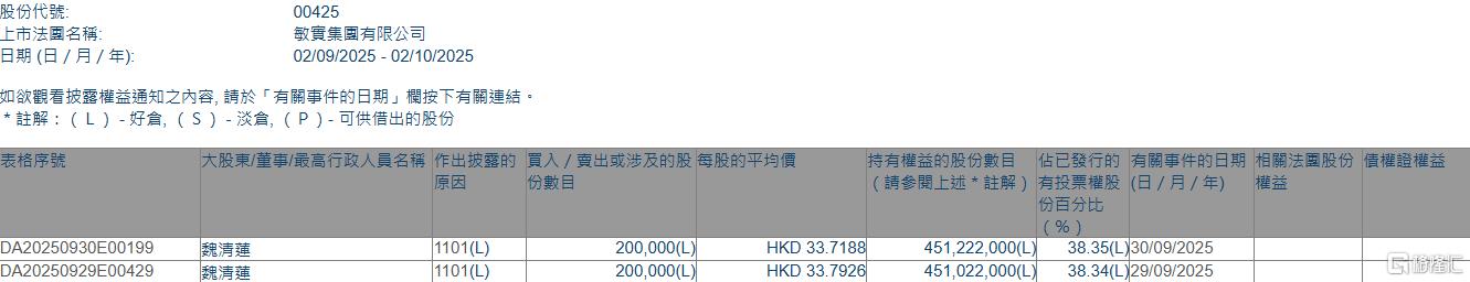 格隆汇10月2日丨根据联交所最新权益披露资料显示,2025年9月29日-9月30日,敏实集团(00425.HK)获执行董事魏清莲在场内以每股均价33.7188-33.7926港元合计增持40万股,涉资约1350.23万港元。