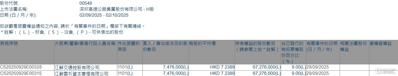 格隆汇10月2日丨根据联交所最新权益披露资料显示,2025年9月29日,深圳高速公路股份(00548.HK)获江苏云杉资本管理有限公司在场内以每股均价7.2389港元增持747.6万股,涉资约5411.8万港元。