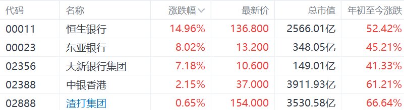 在恒生银行大涨的带动下,香港本地银行股集体上涨。其中,恒生银行涨近15%,东亚银行涨8%,大新银行集团涨超7%,中银香港涨超2%。