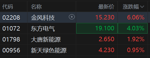 港股风电股继续上涨行情,其中,金风科技涨超6%续刷阶段新高,东方电气涨超4%,大唐新能源涨2%,新天绿色能源涨约1%。