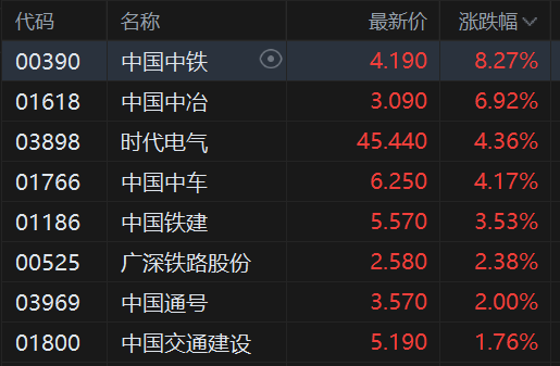 港股高铁基建股大幅拉升,中国中铁一度大涨超10%领衔,中国中冶涨7%,时代电气、中国中车涨超4%,中国铁建涨3.5%,中国通号、中国交通建设跟涨。
