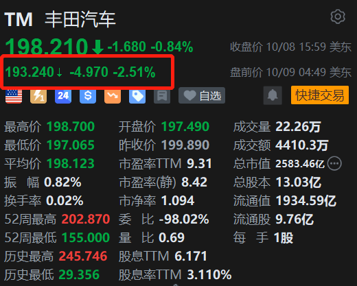丰田汽车(TM.US)美股盘前跌2.5%。消息上,近日,据美国联邦交通安全监管机构信息显示,由于软件错误原因,导致在行驶过程中挂入倒挡时或存在无法显示倒车影像的情况,降低驾驶员视野,存在安全隐患,丰田在美宣布召回393838辆汽车。