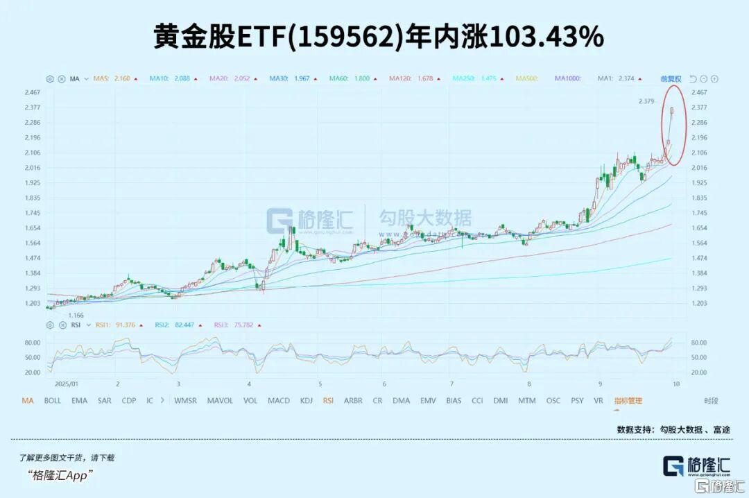 A股10月首个交易日,黄金资产大涨黄金股ETF(159562)大涨8.95%,年内涨103.43%;黄金ETF华夏(518850)涨4.53%,年内涨47.54%。