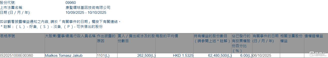 格隆汇10月10日丨根据联交所最新权益披露资料显示,2025年10月6日,康圣环球(09960.HK)获Mialkos Tomasz Jakub在场内以每股均价1.5325港元增持26.25万股,涉资约40.23万港元。