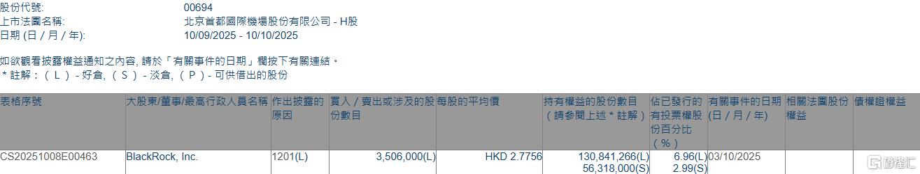 格隆汇10月10日丨根据联交所最新权益披露资料显示,2025年10月3日,北京首都机场股份(00694.HK)遭BlackRock, Inc.在场内以每股均价2.7756港元减持好仓350.6万股,涉资约973.13万港元。