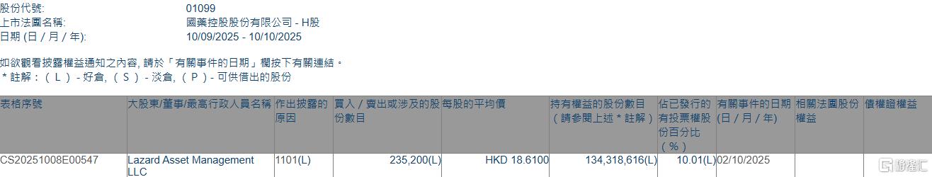 格隆汇10月10日丨根据联交所最新权益披露资料显示,2025年10月2日,国药控股(01099.HK)获Lazard Asset Management LLC在场内以每股均价18.61港元增持23.52万股,涉资约437.71万港元。