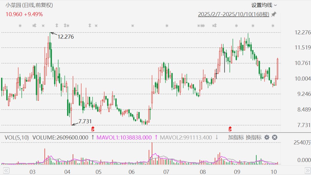 国庆假期经营数据亮眼,小菜园(0999.HK)今日盘中逆势拉升涨近107%,报11.01港元,为连续第二日上涨。