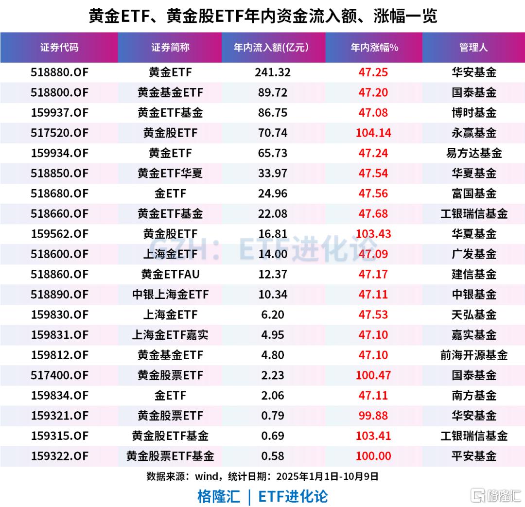 截至10月9日,黄金ETF涨超47%,黄金股ETF涨超100%。