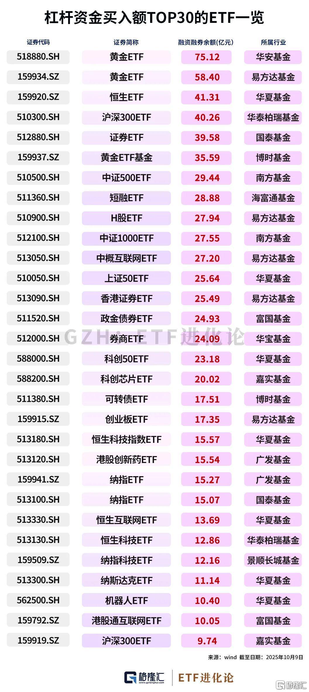杠杆资金钟爱黄金ETF。杠杆资金买入额前10的的ETF分别为:华安黄金ETF、易方达黄金ETF、华夏恒生ETF、华泰柏瑞沪深300ETF、国泰证券ETF、博时黄金ETF基金、南方中证500ETF、海富通短融ETF、易方达H股ETF、南方中证1000ETF。