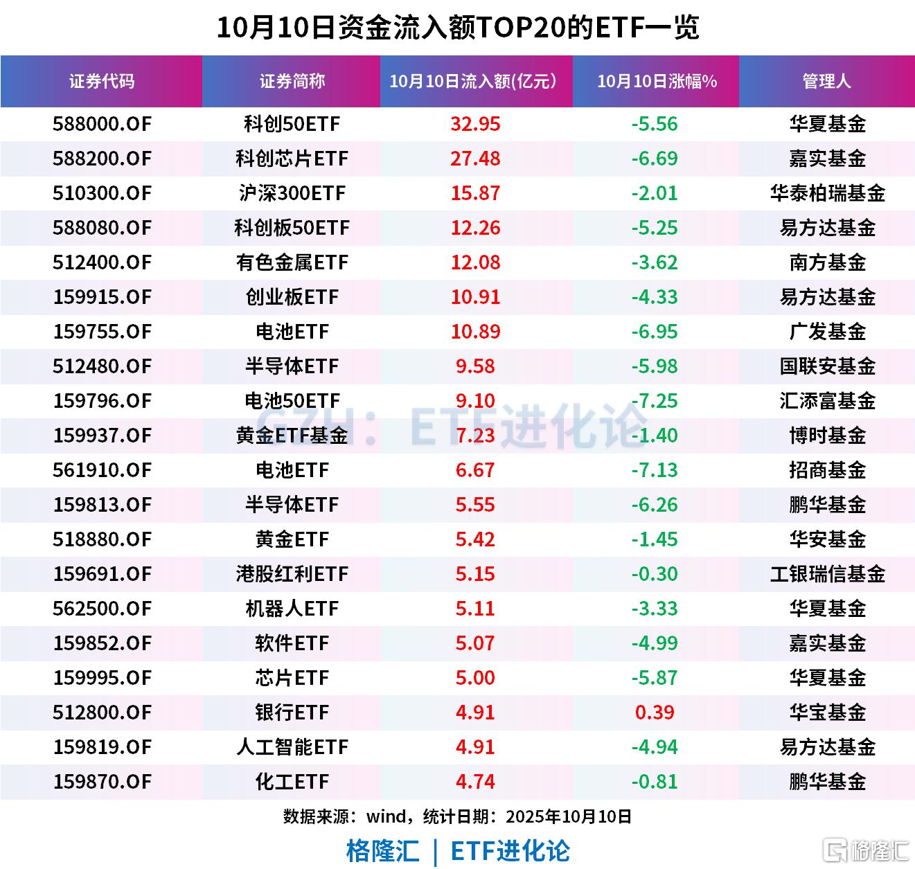 10月10日当天,科创50ETF资金净流入32.95亿元;科创芯片ETF资金净流入27.48亿元;沪深300ETF、科创板50ETF、有色金属ETF、创业板ETF、电池ETF分别吸金超10亿元;半导体ETF、电池50ETF、黄金ETF基金、电池ETF、鹏华半导体ETF、黄金ETF、港股红利ETF、机器人ETF、软件ETF、芯片ETF资金净流入额均超5亿元。