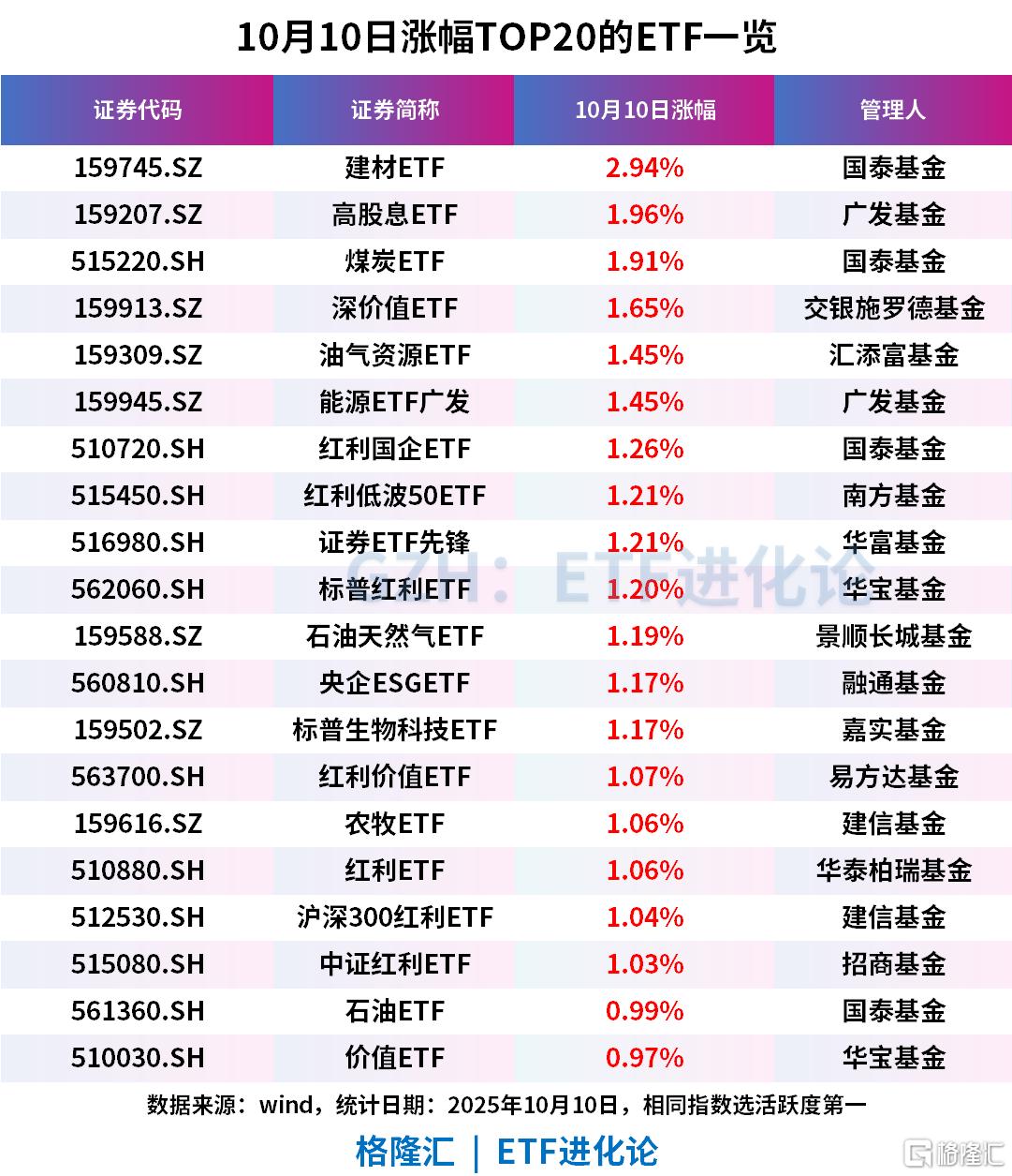 ETF方面,建材ETF涨超2%;高股息ETF、煤炭ETF、深价值ETF、油气资源ETF、能源ETF广发、红利国企ETF、红利低波50ETF、证券ETF先锋、标普红利ETF、石油天然气ETF、央企ESGETF、标普生物科技ETF、红利价值ETF、农牧ETF、红利ETF、沪深300红利ETF、中证红利ETF涨超1%。