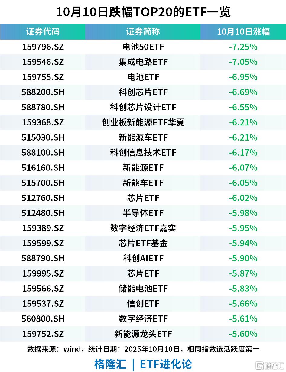 电池50ETF、集成电路ETF跌超7%;电池ETF、科创芯片ETF、科创芯片设计ETF、创业板新能源ETF华夏、新能源车ETF、科创信息技术ETF、新能源ETF、新能车ETF、芯片ETF跌超6%。