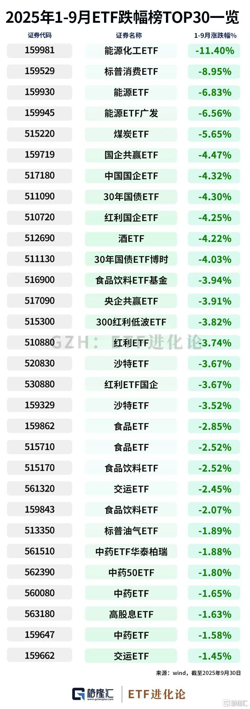 从ETF表现看,今年前三季度 ,港股医药领涨,港股创新药ETF、港股创新药50ETF、港股通医疗ETF富国、恒生创新药ETF翻倍;通信ETF、黄金股ETF、创业板人工智能ETF涨幅居前;能源ETF、煤炭ETF、酒ETF年内跌幅居前。