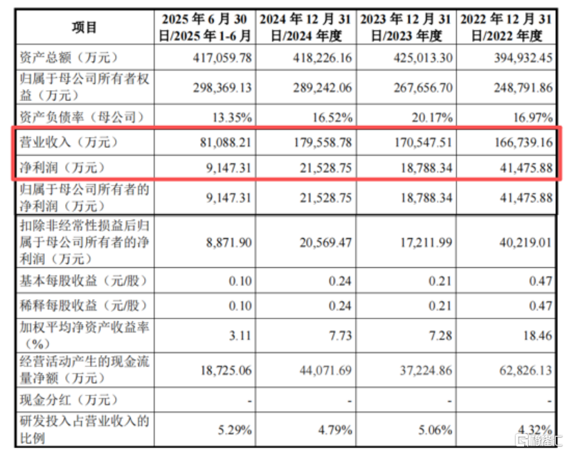 2022年、2023年、2024年和2025年1-6月(报告期),公司营业收入分别为16.67亿元、17.05亿元、17.96亿元和8.11亿元,归属于母公司所有者的净利润分别为4.15亿元、1.88亿元、2.15亿元和9147.31万元,2023年净利润大幅下滑。
