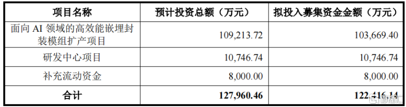 越亚半导体本次募集资金总额为12.8亿元,主要用于面向AI领域的高效能嵌埋封装模组扩产项目、研发中心项目和补充流动资金。