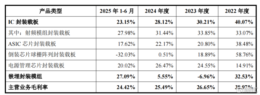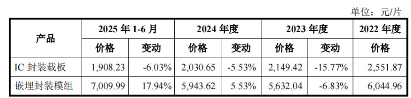 2024年和2025年1-6月,受消费类等应用市场竞争、下游市场需求等影响,射频模组封装载板、倒装芯片球栅阵列封装载板等产品销售价格下降。