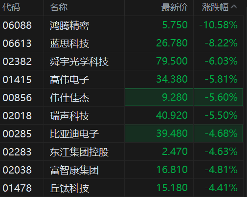 港股苹果概念股集体下挫,其中,鸿腾精密跌超10%,蓝思科技跌超8%,舜宇光学跌6%,高伟电子跌5.8%,瑞声科技、伟仕佳杰跌5.5%,比亚迪电子、富智康集团、丘钛科技跌超4%以上。