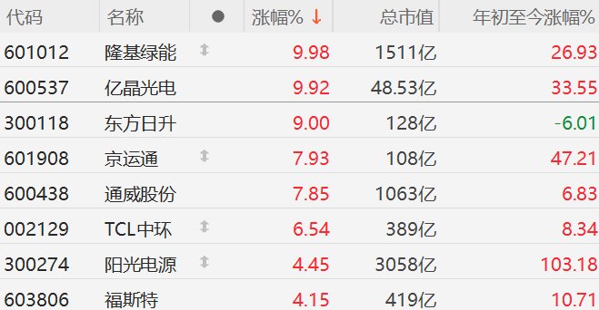 A股市场光伏股集体走强,其中,隆基绿能、亿晶光电涨停,京运通一度涨停,东方日升涨9%,通威股份涨超7%,TCL中环涨超6%,阳光电源、福斯特涨超4%。有媒体援引多位行业企业人士消息称,光伏行业预计有重要政策将发布,行业反内卷将有新进展。消息还称相关主管部门或将发布一份关于加强光伏产能调控的通知文件。