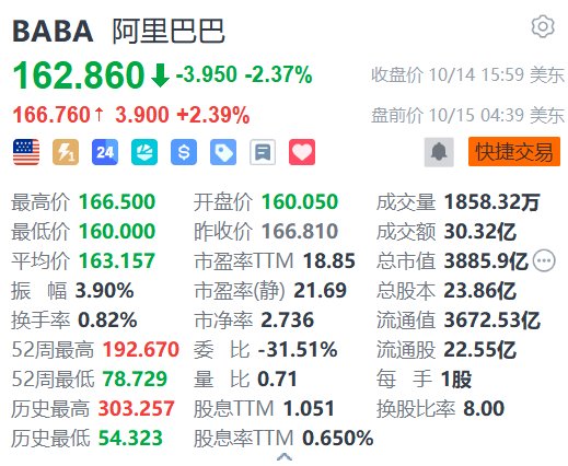 阿里巴巴(BABA.US)盘前涨2.39%报166.76美元。消息面上,天猫双11今晚8点正式开启。今年天猫双11官方立减85折基础上,再叠加9折消费券、行业品类券、购物金等。88VIP迎来史上最大3250元券包,含1350元无门槛9折消费券。(格隆汇)