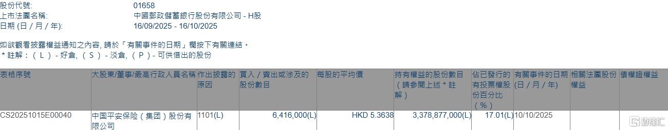 格隆汇10月16日丨根据联交所最新权益披露资料显示,2025年10月10日,邮储银行(01658.HK)获中国平安保险(集团)股份有限公司在场内以每股均价5.3638港元增持641.6万股,涉资约3441.41万港元。