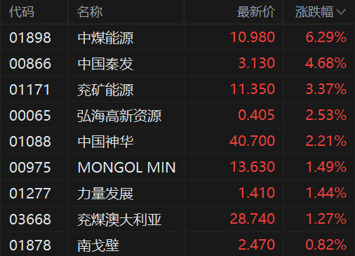 港股煤炭集体拉升上涨,其中,中煤能源涨超6%,中国秦发涨近5%,兖矿能源涨超3%,中国神华涨超2%,力量发展、兖煤澳大利亚涨超1%,南戈壁涨0.8%。