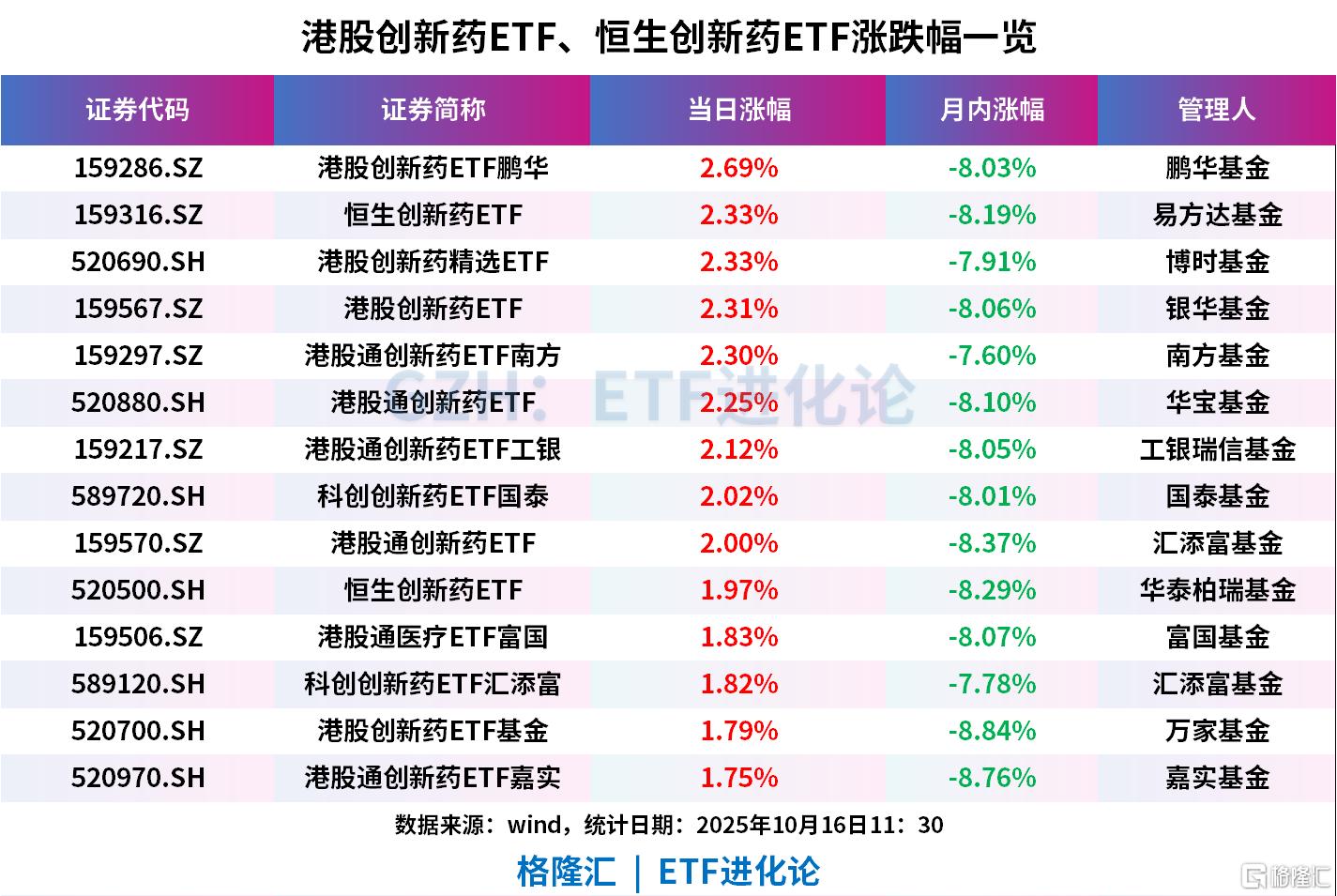 盘面上,创新药概念股再度走强,港股创新药ETF鹏华、恒生创新药ETF、港股创新药精选ETF、港股创新药ETF、港股通创新药ETF南方、港股通创新药ETF、港股通创新药ETF工银、科创创新药ETF国泰、港股通创新药ETF涨超2%。