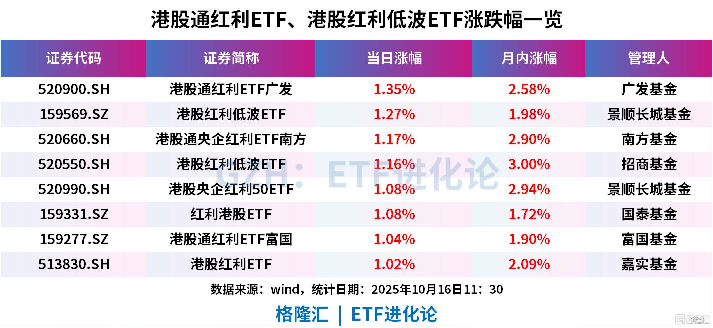 港股通红利ETF广发、港股红利低波ETF、港股通央企红利ETF南方、港股央企红利50ETF、红利港股ETF、港股通红利ETF富国、港股红利ETF涨超1%。