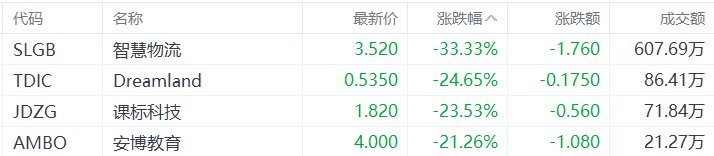 美股异动丨智慧物流跌33.33%,为跌幅最大的中概股