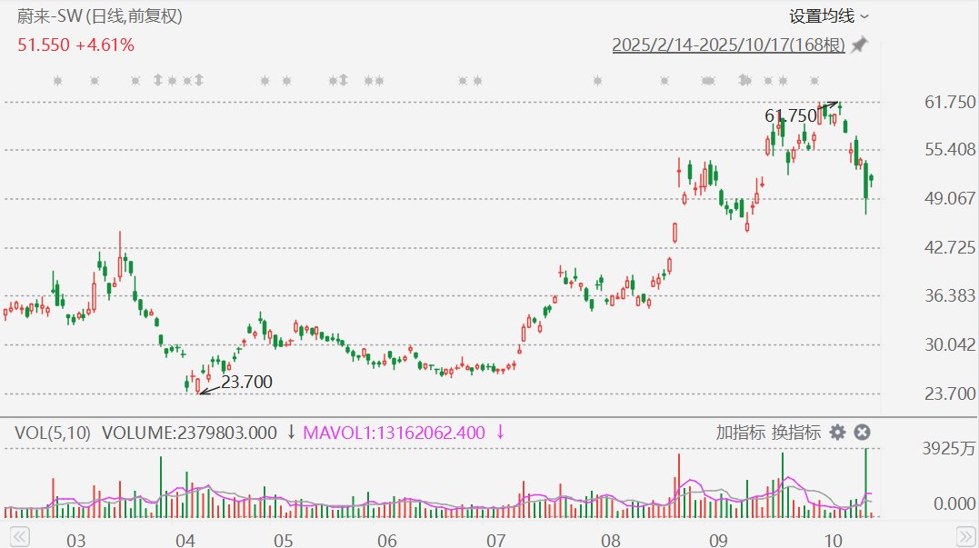 昨日一度大跌13%的蔚来-SW(9866.HK)今日盘中反弹,盘初一度涨超6%报52.3港元。