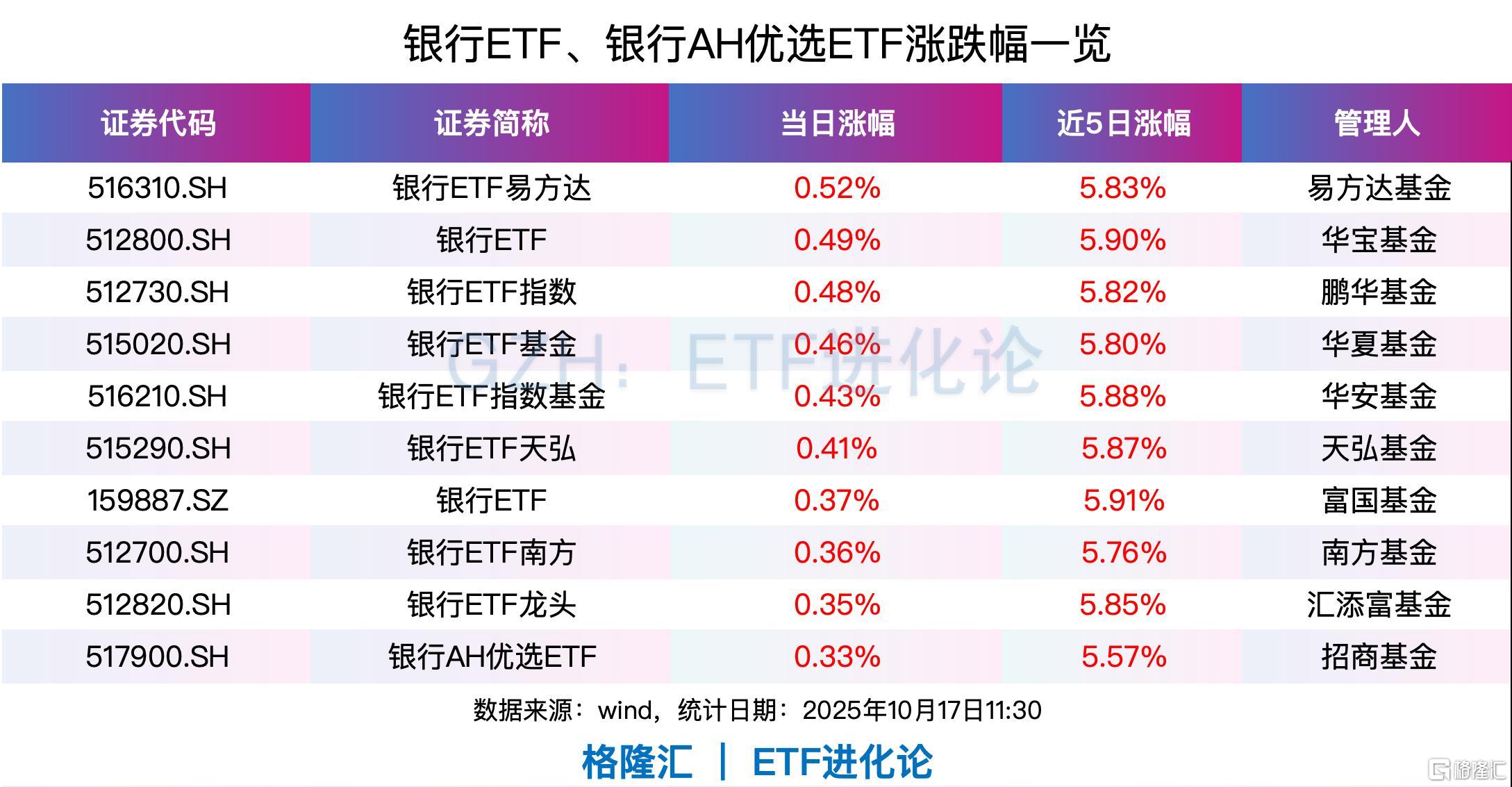 银行ETF易方达、银行ETF、银行ETF指数、银行ETF基金、银行ETF指数基金、银行ETF天弘、银行ETF、银行ETF南方、银行ETF龙头、银行AH优选ETF上涨,近5日涨超5%。