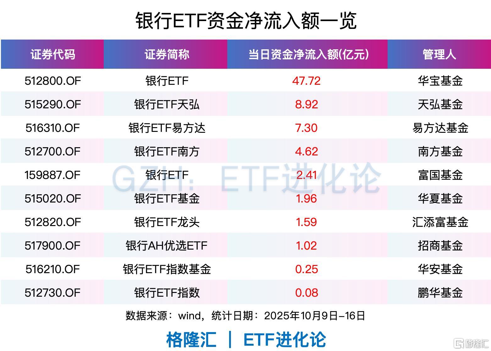 其中,华宝银行ETF吸金47.72亿元,银行ETF吸金8.92亿元,银行ETF易方达净流入额超7.3亿元。