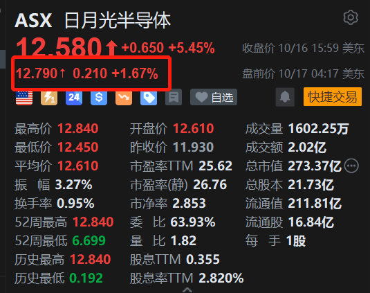 连续上涨的日月光半导体(ASX.US)盘前继续涨约2%,该股昨日盘中涨超7%创历史新高。消息上,日月光半导体近日公布,9月营收为605.6亿新台币,同比增长9%;第三季度营收为1685.7亿新台币,同比增长5.3%。此外,日月光先进封装K18B新厂,日前扩产动工!K18B新厂预计2028年首季投产,届时将创造近2000个就业岗位。(格隆汇)