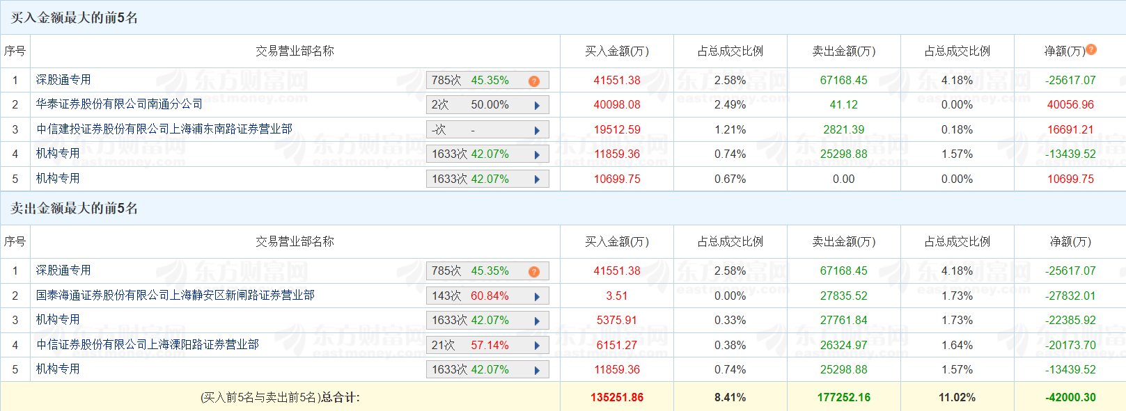 中兴通讯(000063.SZ)今日跌停,换手率7.94%,成交额160.78亿元。龙虎榜数据显示,深股通买入4.16亿元,卖出6.72亿元,净卖出2.56亿元;三家机构买入2.79亿元,卖出5.31亿元,净卖出2.51亿元;游资“孙哥”位列卖四席位,净卖出2.02亿元;华泰证券南通分公司位列买二席位,净买入4.01亿元。上榜席位全天买入13.53亿元,卖出17.73亿元,合计净卖出4.2亿元。(格隆汇)
