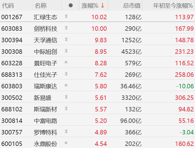 A股市场CPO概念表现强势,其中,汇绿生态、剑桥科技涨停,天孚通信涨超9%,中际旭创、景旺电子涨超8%,仕佳光子涨超7%,瑞斯康达、新易盛、斯瑞新材、中富电路涨超5%。消息面上,兴证通信产业链调研显示,1.6T光模块需求持续上调。海外大客户近期上修2026年1.6T光模块采购计划,部分客户提前锁定明年产能,行业总需求预计从1000万上修到1500万,再到近期的2000万只,主要系GB300与后续Rubin平台加速部署,AI训练与推理网络带宽需求快速增长,1.6T产品进入量产放量。