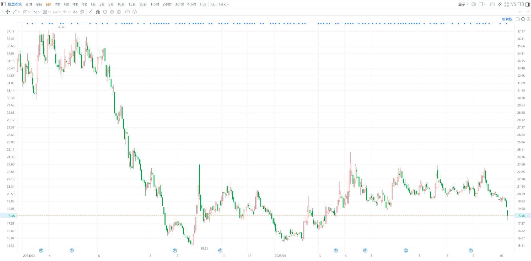 巨星农牧(603477.SH)今日盘中一度跌7.06%至17.91元,股价创今年3月12日以来逾7个月新低。巨星农牧公告,股东四川和邦投资集团有限公司拟减持不超2%公司股份。(格隆汇)