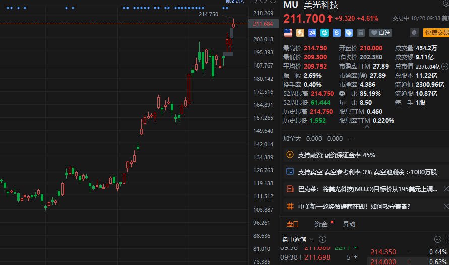美光科技(MU.US)盘初涨超5%,高见214.75美元刷新上市新高价。消息上,近日美光科技持续获大行上调目标价。巴克莱将美光科技目标价从195美元上调至240美元;瑞穗将美光科技的目标价从195美元上调至240美元,维持“跑赢大市”评级;花旗将美光科技的目标价从200美元上调至240美元,维持“买入”评级。(格隆汇)