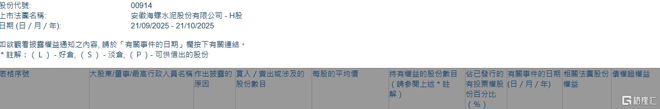 格隆汇10月21日丨根据联交所最新权益披露资料显示,2025年10月15日,海螺水泥(00914.HK)获JPMorgan Chase & Co.以每股均价25.5317港元增持好仓330.37万股,涉资约8435万港元。