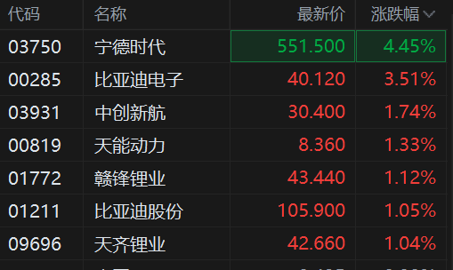 港股锂电池股拉升,其中,宁德时代盘初涨超6%,比亚迪电子涨3.5%,中创新航涨近2%,天能动力、赣锋锂业、天齐锂业、比亚迪股份均涨超1%。